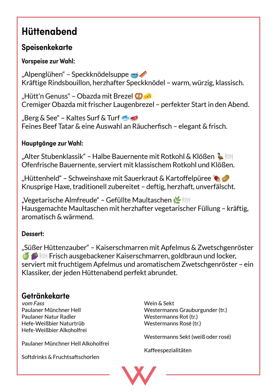Freut euch auf ein gemütliches Hütten-Feeling mit herzhaften Schmankerln und frisch gezapften Getränken. Dazu gibt es Musik und beste Stimmung – perfekt, um mit Freunden, Familie oder Kollegen einen unvergesslichen Abend zu erleben. Ob beim gemeinsamen Anstoßen, beim Genießen der kulinarischen Köstlichkeiten oder beim Mitsingen: