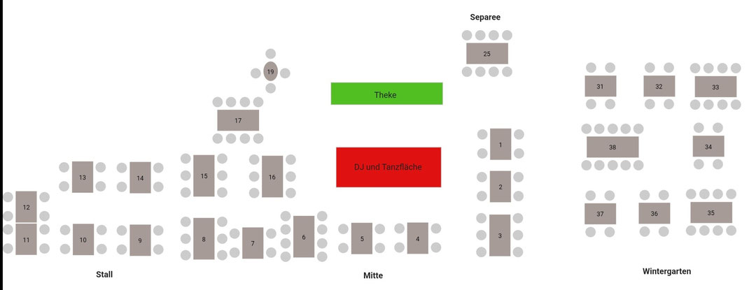 Anmerkung: Tisch 25 ist ein separater kleiner Raum. Tisch 17 ist ein Hochtisch.