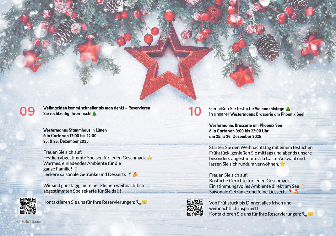 Erleben Sie unvergessliche Festtage in gemütlicher Atmosphäre! Genießen Sie unser festliches Weihnachtsmenü (à la Carte) im Stammhaus in Lünen oder in der Brasserie am Phoenix See – jeweils mit saisonalen Köstlichkeiten. Wir bieten den perfekten Rahmen für Ihre Weihnachtszeit. Reservieren Sie jetzt und sichern Sie sich die besten Plätze für ein Festessen oder Weihnachtsbrunch!